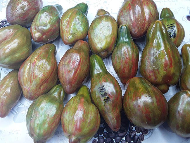 Томат Кубинский Салями /Cuban Salami/. Индетерминантный, высокорослый (1,8 м), среднеспелый урожайный сорт с очень необычной расцветки и формы плодами. Необходима подвязка к опоре и пасынкование, формировать лучше в 2-3 стебля. Плоды перцевидно-грушевидной формы, неровные. Цвет томатов в стадии зрелости зеленые с бордовыми полосками и штрихами. Масса плодов 100-150 граммов. Мякоть триколорная, яркая, малосемянная, мясистая, хорошего помидорного вкуса. Стенки у плодов толстые. Помидорки хороши для свежего потребления, консервирования, вяления и заморозки.