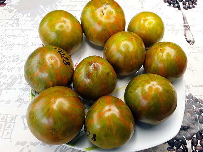 Томат Зебра Пиканте /Zebra Picante/. Индетерминантный, среднерослый (1,2-1,5 м), среднеспелый, урожайный сорт. Для теплиц и ОГ, формировать лучше в 2-3 стебля. Плоды светло-малиновые с тёмно-зелёными полосками, весом 80-150 гр., сладкие, вкусные с экзотическими нотками.
