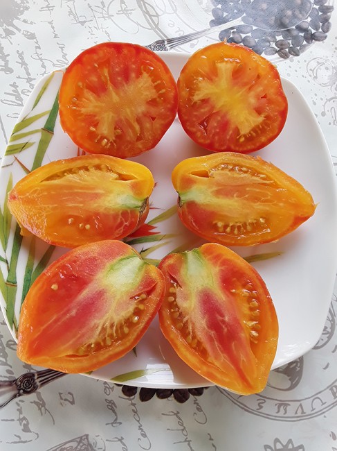 Томат Похвала / Гордость Марины /Marina's Praise/ США. Гордость, Похвала Марины - редкий сорт от селекционера Джейсона Хейнса, полученный от скрещивания сортов Оранжевый Русский 117 и Potato Leaf Variegated. На испытания был отправлен селекционеру Марине Кирищёвой живущей в городе Брянске. Впоследствии этот сорт Jason Haynes назвал в честь неё "Marina's Praise". Индетерминантный, высокорослый 1,6-1,8 м), с хорошей урожайностью и длительным плодоношением до конца сезона. Помидорки просто загляденье, такие милые вытянутые сердечки с алым румянцем на боках. Они не только красивые, но и очень вкусные, безумно сладкие, с явно выраженным фруктовым вкусом, с мармеладной, сладкой мякотью. Необходима подвязка к опоре и формирование, вести лучше в 2-3 стебля. На стадии рассады проявляется вариегатность листьев, у взрослых растений окраска листьев обычная-зелёная.