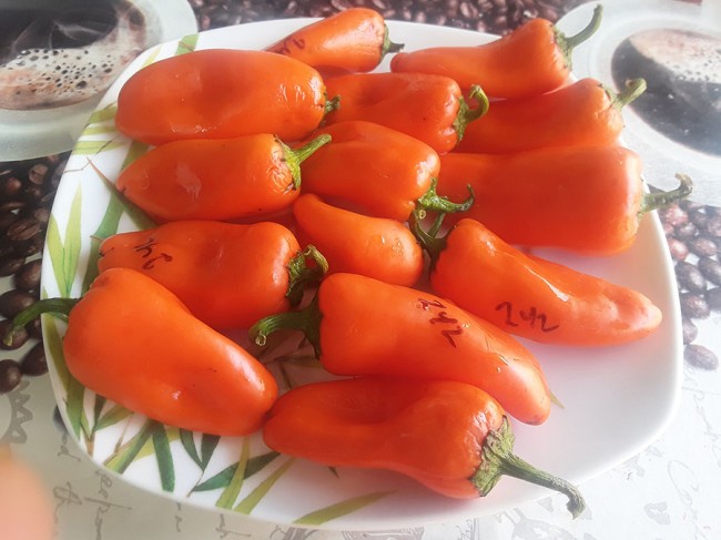 Перец сладкий Апельсин. Сорт среднеспелый, поражающий своей урожайностью. С одного компактного кустика ( 40-50 см высотой) можно получить до 30 сладчайших перчиков! Плоды некрупные яркого оранжевого цвета конусовидные, весом 40-50г. Семян в них очень-очень мало. Стенки для такого малыша не тонкие, очень сочные, необыкновенно сладкого вкуса. Подходит для жарки, гриля, фарширования, сушки. Конечно, рекомендую и для свежего потребления, особенно детям.